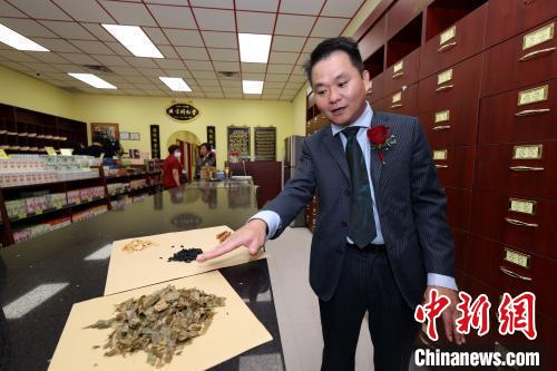 當(dāng)?shù)貢r間9月1日,加拿大多倫多,北京同仁堂位于大多倫多地區(qū)的第四家分店在安大略省列治文山(Richmond Hill)市開業(yè)。圖為北京同仁堂(多倫多)有限公司副總經(jīng)理肖常國向記者介紹店內(nèi)中藥材?!≈行律缬浾?余瑞冬 攝