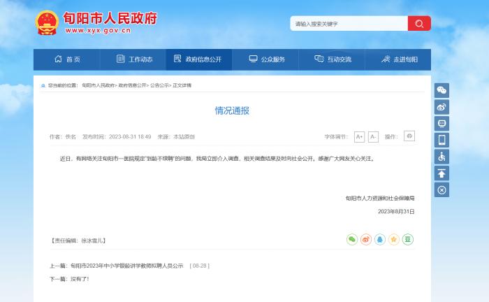 8月31日,據(jù)旬陽市人民政府網(wǎng)站發(fā)布情況通報,旬陽市人力資源和社會保障局已對此介入調(diào)查,相關(guān)調(diào)查結(jié)果及時向社會公開。