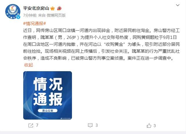 中新網(wǎng)9月3日電 3日,北京市公安局房山分局官方微博發(fā)布情況通報(bào)稱,近日,網(wǎng)傳房山區(qū)周口店鎮(zhèn)一河道內(nèi)出現(xiàn)碎金,附近居民前往淘金。房山警方經(jīng)工作查明,隗某某(男,26歲)為提升個(gè)人社交賬號(hào)熱度,網(wǎng)購(gòu)黃銅顆粒于9月1日在周口店地區(qū)一河道內(nèi)拋撒,并在河邊以“收購(gòu)黃金”為噱頭,吸引附近部分居民前往撿拾。現(xiàn)場(chǎng)相關(guān)視頻在網(wǎng)上傳播后,引發(fā)社會(huì)關(guān)注。隗某某的行為嚴(yán)重?cái)_亂社會(huì)秩序,造成不良影響,已被房山警方刑事立案?jìng)刹?。案件正在進(jìn)一步調(diào)查中。