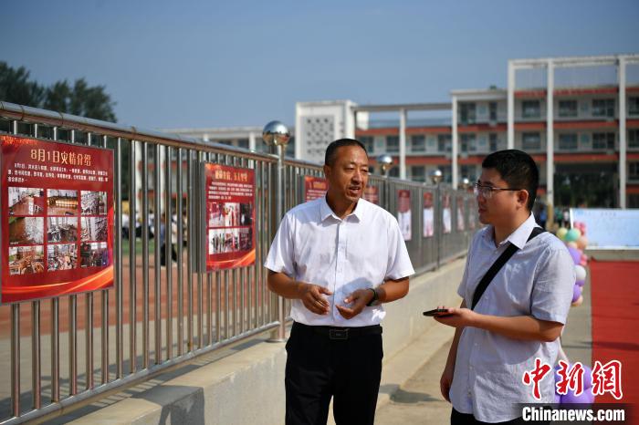 9月1日,涿州市刁窩中學(xué)校長孫常見(左)向中新社記者講述“筑夢(mèng)路”背后的故事?!≈行律缬浾?翟羽佳 攝
