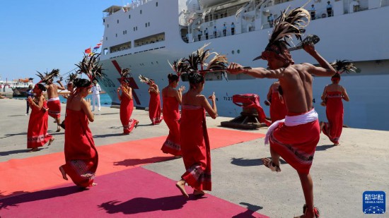 上午10時(shí)許,東帝汶政府在碼頭舉行了隆重的歡迎儀式,總統(tǒng)奧爾塔前來碼頭迎接并發(fā)表致辭。東國防軍司令法魯爾中將,中國駐東帝汶大使館、中資機(jī)構(gòu)、中國援東醫(yī)療隊(duì)、華僑華人等300余人在碼頭迎接。當(dāng)?shù)孛癖娤蛑蟹街笓]員獻(xiàn)上圍巾,身著民族特色服飾的東舞蹈隊(duì)員載歌載舞,華僑華人進(jìn)行了舞龍舞獅表演。