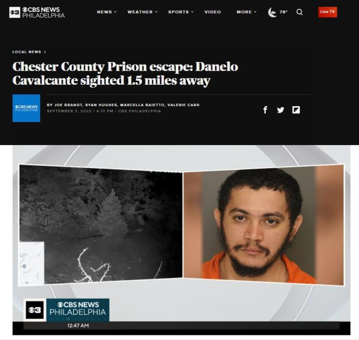 據(jù)報道,該犯人為34歲的達內洛·卡瓦爾坎特。當?shù)貢r間8月31日上午,他在等待被轉移至州監(jiān)獄時,從賓州費城郊區(qū)的監(jiān)獄越獄,官方尚未透露其越獄的細節(jié)。