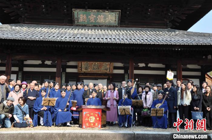 2012年4月8日,上海城隍廟道樂團與日本觀眾在萬福寺大雄寶殿前合影?!?上海市道教協(xié)會供圖)