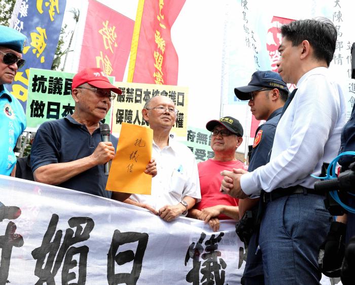 9月6日,臺(tái)灣數(shù)十個(gè)政黨和團(tuán)體組成的反“臺(tái)獨(dú)”反介入聯(lián)合行動(dòng)在臺(tái)北集會(huì),抗議日本將核污染水排入海洋,要求民進(jìn)黨當(dāng)局嚴(yán)禁從日本核污染地區(qū)進(jìn)口食物。圖為臺(tái)灣勞動(dòng)黨主席吳榮元(左二)向民進(jìn)黨當(dāng)局食品安全辦公室官員(右一)遞交抗議信。