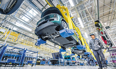 長(zhǎng)江經(jīng)濟(jì)帶生產(chǎn)制造和出口的新能源汽車日漸成為中國出口的“金名片”。圖為一家車企江蘇常州基地的工人在加緊生產(chǎn)。