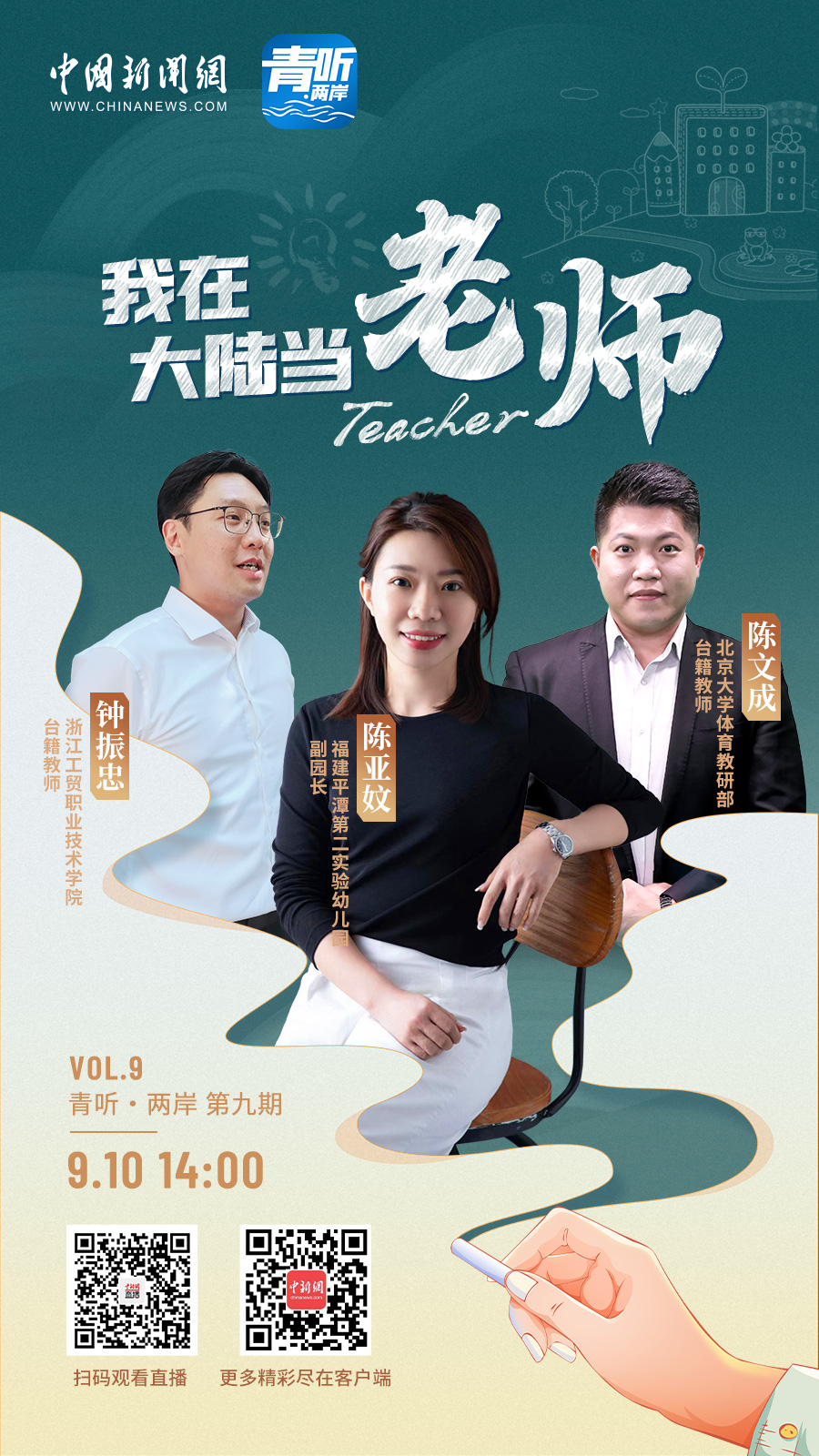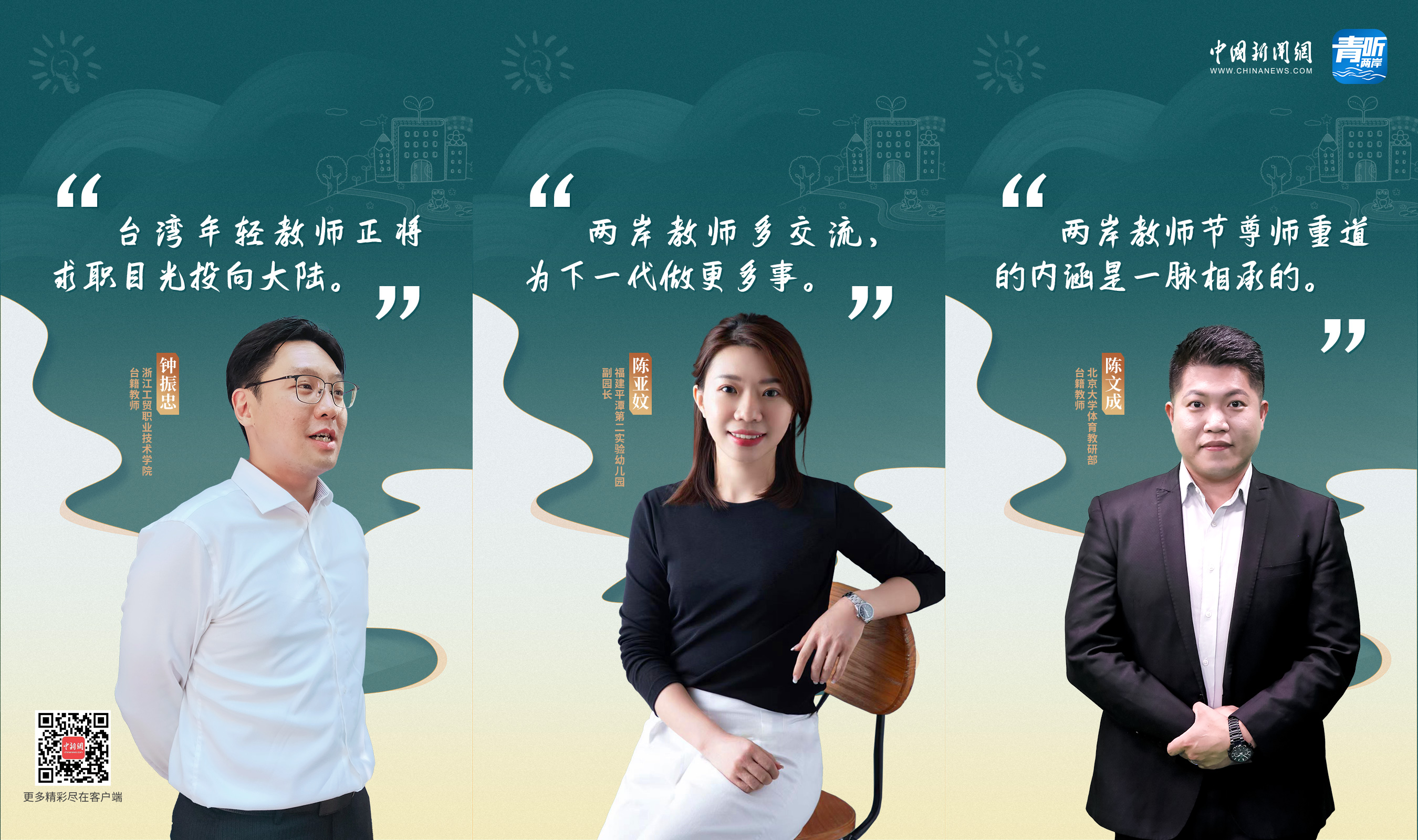 教師節(jié)這天,北京大學(xué)體育教研部教師陳文成、浙江工貿(mào)職業(yè)技術(shù)學(xué)院教師鐘振忠、福建平潭第二實(shí)驗(yàn)幼兒園副園長陳亞妏,三位臺(tái)籍教師做客中國新聞網(wǎng)《青聽·兩岸》欄目,分享了他們“登陸”做老師的故事。