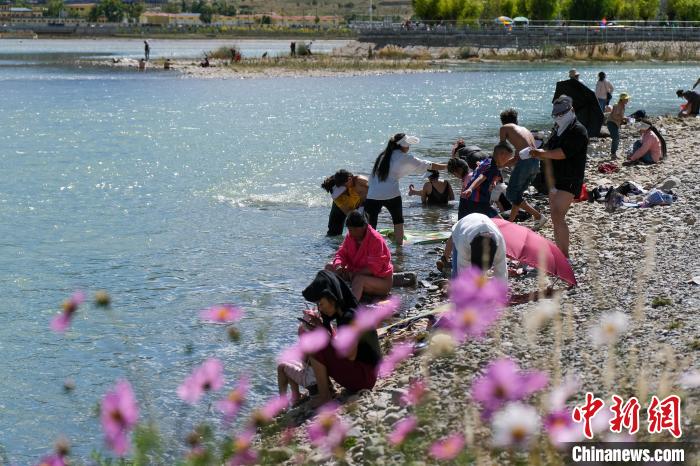 中新社拉薩9月10日電 (記者 江飛波)9月10日是藏歷七月二十六,恰逢周末,西藏民眾迎來傳統(tǒng)沐浴節(jié)第二天。拉薩河畔格?;▍仓袀鞒鲫囮囨倚Υ螋[聲,不少藏族家庭舉家在河畔或梳洗、游泳、跳水、日光浴,或是在河畔一邊閑話,一邊煮著甜茶、牦牛肉等,享受愜意的沐浴節(jié)時光。