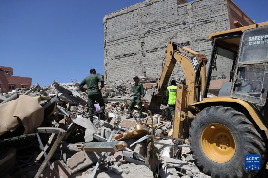 9月11日,救援人員在摩洛哥馬拉喀什南部的艾米茲米茲村地震廢墟上搜救。新華社記者王東震攝