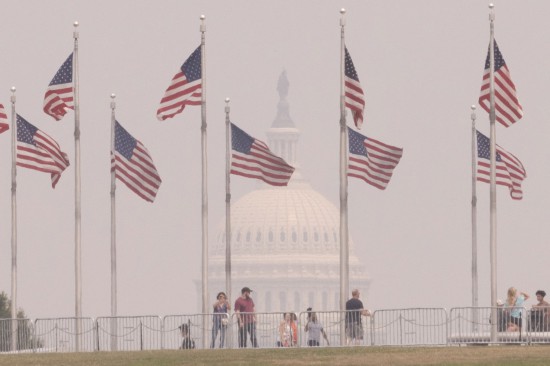 6月29日,在美國(guó)首都華盛頓,游客在華盛頓紀(jì)念碑游覽,遠(yuǎn)處的國(guó)會(huì)大廈籠罩在煙霧中。新華社發(fā)(亞倫攝)