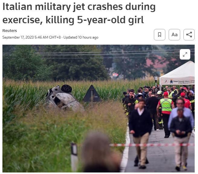 中新網(wǎng)9月17日電 綜合外媒報(bào)道,當(dāng)?shù)貢r間16日,意大利空軍“三色箭”飛行表演隊(duì)的一架飛機(jī)在都靈郊外訓(xùn)練時墜毀,導(dǎo)致地面一名5歲女童身亡,飛行員在墜毀前彈射逃生。