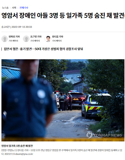 據(jù)報道,15日下午3時54分,韓國警察廳接到了關(guān)于全羅南道靈巖郡金某住宅窗戶上有血跡的報警。當?shù)鼐脚c消防急救隊一同前往,進入該住宅后發(fā)現(xiàn)了金某、金某妻子以及金某夫婦的三名20多歲兒子的尸體。