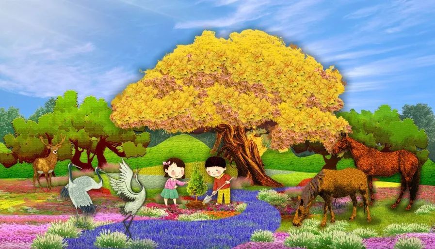 4. 東單西北角的“和諧共生”花壇頂高8.5米,以“三北工程”綠色長(zhǎng)城為主景,配以野馬(西北)、麋鹿(華北)、白鶴(東北)、胡楊等典型物種,體現(xiàn)了生態(tài)治理的典范,寓意堅(jiān)定不移走好人與自然和諧共生的中國(guó)式現(xiàn)代化之路。