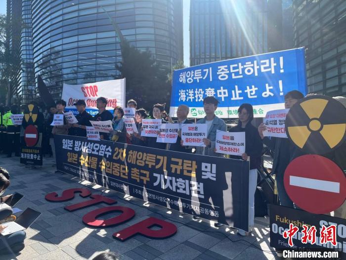中新社首爾10月5日電 (劉旭 金琳)5日上午,韓國(guó)市民團(tuán)體在位于首爾鐘路區(qū)的日本駐韓國(guó)大使館前舉行記者招待會(huì)和集會(huì),譴責(zé)日本福島第一核電站核污染水第二輪排海,并敦促韓國(guó)政府停止進(jìn)口日本水產(chǎn)品。