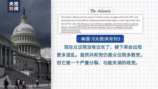 美國《大西洋月刊》評論說,現(xiàn)在眾議院沒有議長了,接下來會出現(xiàn)更多混亂。雖然共和黨仍是眾議院多數(shù)黨,但它是一個嚴(yán)重分裂、功能失調(diào)的政黨。