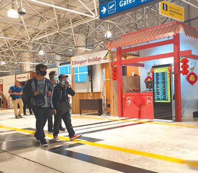 旅客經(jīng)過埃塞俄比亞博萊國際機場內(nèi)的中文服務臺。