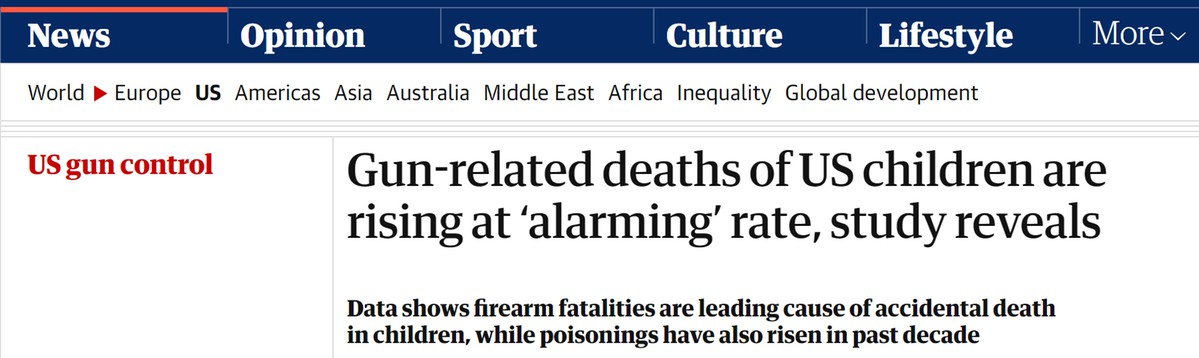 據(jù)英國(guó)《衛(wèi)報(bào)》網(wǎng)站5日?qǐng)?bào)道,美國(guó)波士頓兒童醫(yī)院(Boston Children's Hospital)研究人員進(jìn)行的一項(xiàng)新的研究發(fā)現(xiàn),在過去十年中,美國(guó)與槍支有關(guān)的兒童死亡人數(shù)激增,漲幅高達(dá)87%。