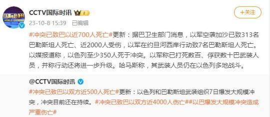 央視網(wǎng)消息:據(jù)CCTV國際時訊微博消息,據(jù)巴衛(wèi)生部門消息,以軍空襲加沙已致313名巴勒斯坦人死亡、近2000人受傷,以軍在約旦河西岸行動致7名巴勒斯坦人死亡。以媒報道稱,以色列至少350人死于沖突。以軍稱已打死數(shù)百、俘獲數(shù)十巴武裝人員,并稱行動還將進一步升級。哈馬斯稱,其武裝人員仍在以色列多地戰(zhàn)斗。