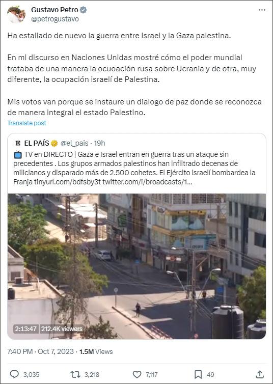 巴以10月7日爆發(fā)的新一輪沖突致中東局勢(shì)驟然緊張,佩特羅當(dāng)天再次要求就巴以問(wèn)題舉行和平對(duì)話,他還特別提及了上月在聯(lián)合國(guó)發(fā)表的一段講話,呼吁西方大國(guó)不要用雙重標(biāo)準(zhǔn)區(qū)別對(duì)待俄烏沖突和巴以沖突。