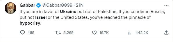 美國(guó)合眾國(guó)際社(UPI)報(bào)道注意到,有很多媒體專欄作者和社交媒體用戶都指出了西方在俄烏沖突等問(wèn)題上的“虛偽行為”,佩特羅并不是唯一一位。例如一名認(rèn)證為“作家”的社交媒體用戶寫(xiě)道:“如果你支持烏克蘭而不支持巴勒斯坦,如果你譴責(zé)俄羅斯卻不譴責(zé)以色列或美國(guó),那么你就已經(jīng)達(dá)到了虛偽的頂峰?!?/p>