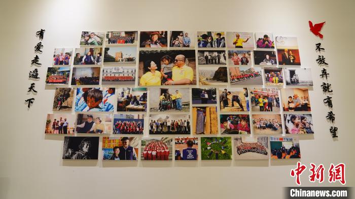 在秦榮華家中的墻上,掛著他過(guò)去30多年來(lái)在大陸各地走訪、參與公益、推動(dòng)兩岸交流的照片。 中新社記者 楊程晨 攝