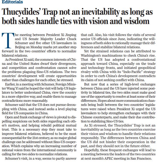 開誠(chéng)布公地交換意見(jiàn)是消除彼此猜疑、重建政治互信的關(guān)鍵,是雙方為穩(wěn)定和改善雙邊關(guān)系而必須邁出的必要一步。中美關(guān)系是21世紀(jì)最具影響力的雙邊關(guān)系,沒(méi)有中美合作,就不可能應(yīng)對(duì)任何重大的全球性挑戰(zhàn)。這也是為什么國(guó)際社會(huì)越來(lái)越多的理性聲音呼吁雙方實(shí)現(xiàn)關(guān)系正?;?。舒默的訪問(wèn)在某種程度上似乎部分回應(yīng)了這一呼聲。繼 6 月以來(lái)多位美國(guó)高官訪華之后,美國(guó)兩黨議員代表團(tuán)來(lái)訪,表明了雙方理性處理分歧、穩(wěn)定雙邊關(guān)系的意愿。
