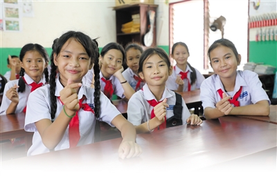 在老撾占塔布里縣中老友好農(nóng)冰村小學的教室里,學生們用手比心,表達對中國的感謝。