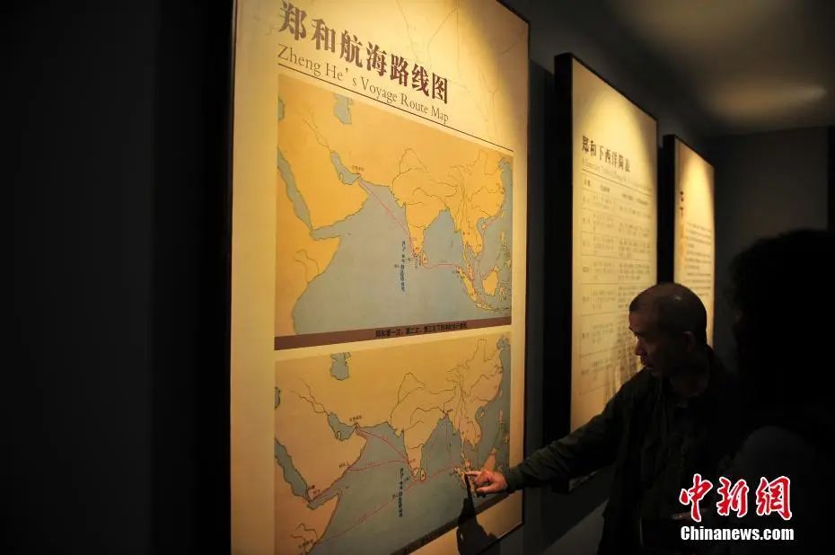 圖為觀眾在鄭和紀念館內(nèi)觀看鄭和航海線路圖。中新社記者 劉冉陽 攝
