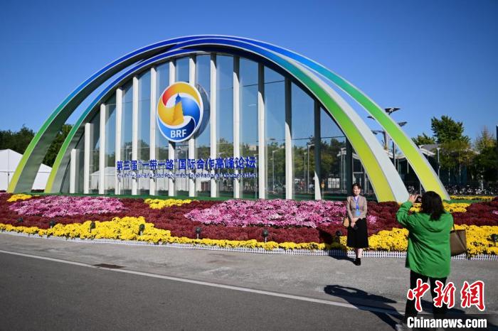 10月15日,北京,工作人員在國(guó)家會(huì)議中心外的第三屆“一帶一路”國(guó)際合作高峰論壇景觀(guān)布置前拍照留念。當(dāng)日,位于國(guó)家會(huì)議中心的第三屆“一帶一路”國(guó)際合作高峰論壇新聞中心啟動(dòng)試運(yùn)行。 中新社記者 田雨昊 攝