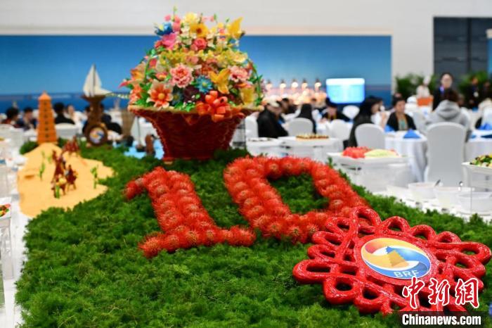 論壇新聞中心大門(mén)兩側(cè)擺放著兩塊主題燈光展板,走近細(xì)看,航行在大海中的帆船、在沙漠中行走的駱駝、“一帶一路”共建國(guó)家標(biāo)志性建筑物等多個(gè)具有象征意義的圖案細(xì)節(jié)盡在其中。在餐廳中央取餐臺(tái)上,代表著共建“一帶一路”倡議10周年的數(shù)字“10”,和祈年殿等中國(guó)古建筑物代表性元素也都精妙地融于一體。