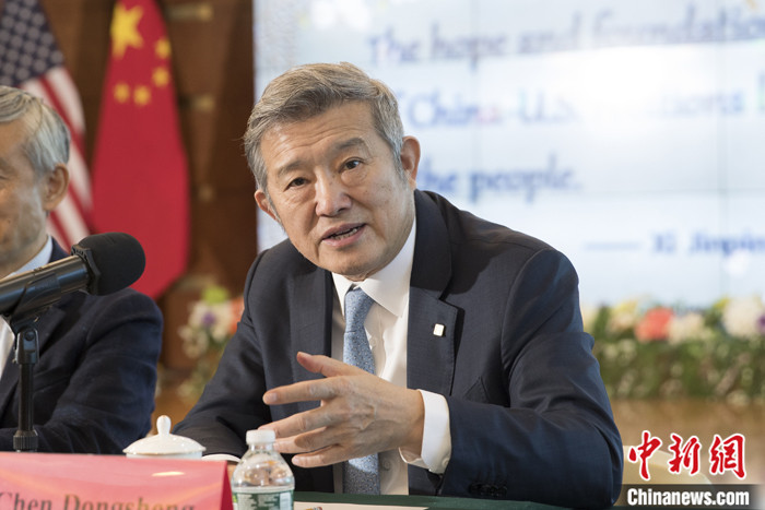 當(dāng)?shù)貢r間10月25日,參加清華大學(xué)和美中關(guān)系全國委員會共同舉辦的“中美民眾對話”活動的部分代表來到中國駐紐約總領(lǐng)事館,就中美經(jīng)貿(mào)關(guān)系、科研合作、人文交流等回答記者提問。被問及中國企業(yè)在美國投資的相關(guān)問題時,泰康保險集團董事長陳東升表示,貿(mào)易和投資對中美關(guān)系十分重要。在美國投資,比如康復(fù)醫(yī)療是一個大的合作方向,我們歡迎美國的企業(yè)來合作,這是互利互惠的過程。 中新社記者 廖攀 攝