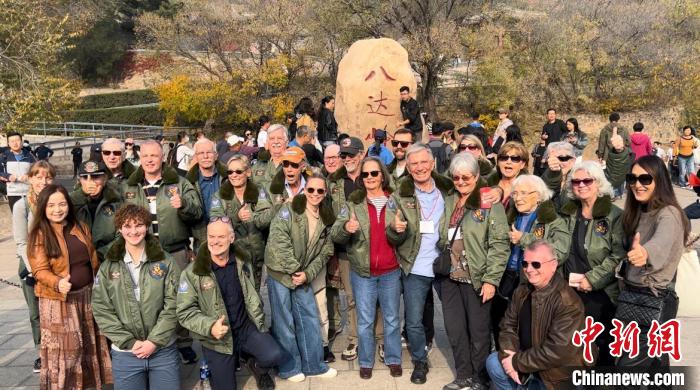 10月29日,美國(guó)飛虎隊(duì)老兵哈里·莫耶、飛虎隊(duì)指揮官陳納德將軍的外孫女尼爾·凱樂威以及一眾飛虎隊(duì)老兵家屬在北京八達(dá)嶺長(zhǎng)城景區(qū)合影留念。中新社記者郭超凱 攝