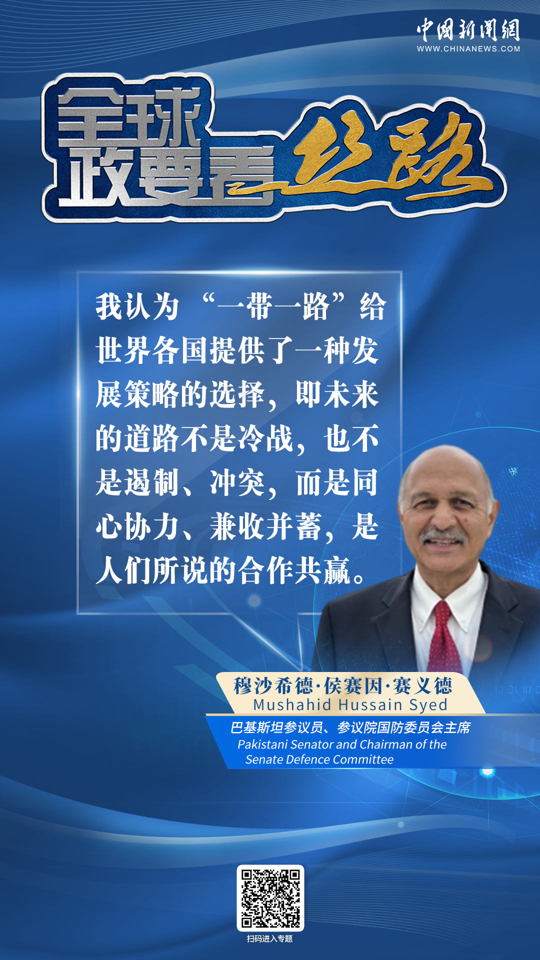 中新網(wǎng)10月28日電(張乃月) “‘一帶一路’給世界各國提供了一種發(fā)展策略的選擇,即未來的道路不是冷戰(zhàn),也不是遏制、沖突,而是同心協(xié)力、兼收并蓄,是人們所說的合作共贏。”巴基斯坦參議員、參議院國防委員會主席穆沙希德·侯賽因·賽義德近日接受中新網(wǎng)專訪時如是說。