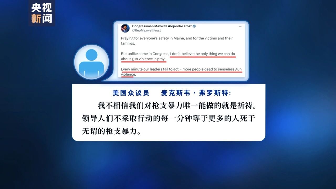 此外,每次槍擊案發(fā)生后,美國擁槍派政客都重復(fù)著空洞的安慰,這次也不例外。在多位擁槍派政客的社交媒體上,各種口頭安慰和無力的陳詞濫調(diào)比比皆是。對(duì)此,美國眾議員麥克斯韋·弗羅斯特(Maxwell Alejandro Frost)發(fā)推文寫道,“我不相信我們對(duì)槍支暴力唯一能做的就是祈禱。領(lǐng)導(dǎo)人們不采取行動(dòng)的每一分鐘等于更多的人死于無謂的槍支暴力。”