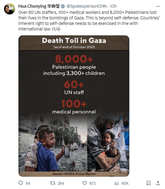據(jù)報(bào)道,當(dāng)天,華春瑩發(fā)帖提及加沙地帶的人員傷亡。她稱,“超過(guò)60名聯(lián)合國(guó)工作人員、100名醫(yī)務(wù)工作者、8000名巴勒斯坦人在對(duì)加沙的轟炸中喪生。這超出了自衛(wèi)的范圍。各國(guó)擁有的自衛(wèi)權(quán)須依據(jù)國(guó)際法行使。”