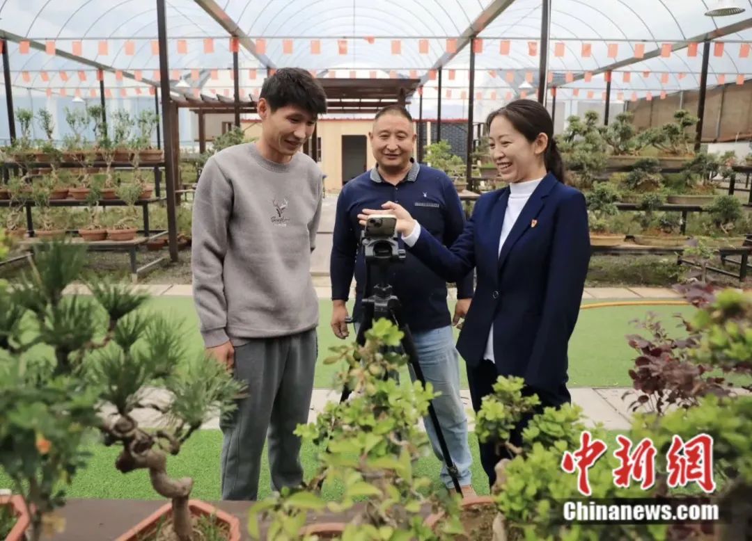 午后,在“中國(guó)盆景淘寶第一村”新河鎮(zhèn)周圈村,花農(nóng)姜愛花忙著給一株刺柏“盛裝打扮”,晚上,這株刺柏會(huì)被送往該村的“花木集市”,數(shù)十名主播將對(duì)其直播競(jìng)拍。