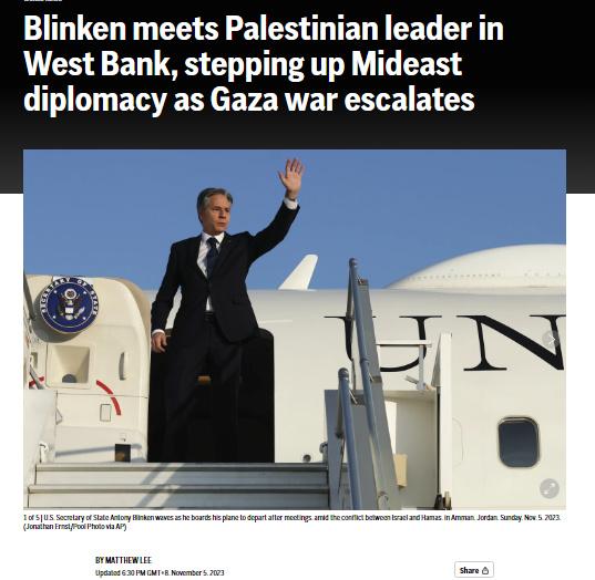 據(jù)報(bào)道,這是本輪巴以沖突爆發(fā)以來,美國最高級別外交官首次到訪約旦河西岸。