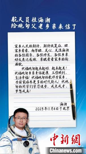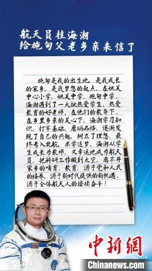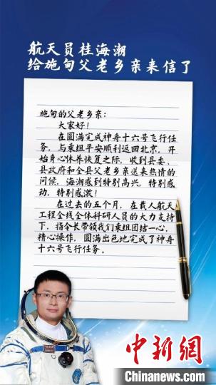 中新網(wǎng)昆明11月5日電(陳靜)記者5日從云南省保山市施甸縣委縣政府獲悉,其收到了航天員桂海潮4日從北京發(fā)來的回信,他在信中表示,感謝家鄉(xiāng)的哺育,期待恢復后,回家鄉(xiāng)看看!