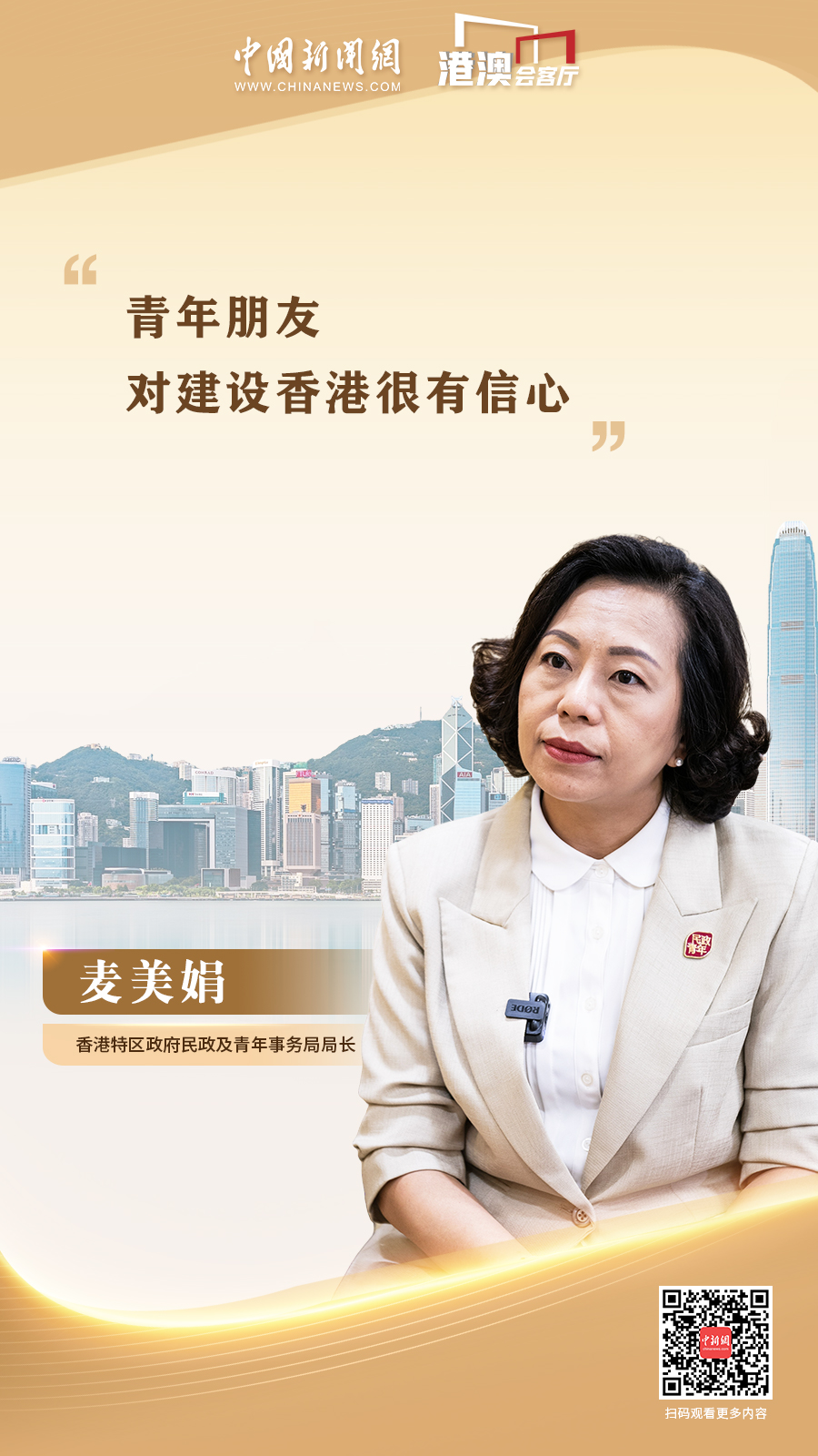 香港特區(qū)政府民政及青年事務(wù)局局長(zhǎng)麥美娟近日接受中國(guó)新聞網(wǎng)“港澳會(huì)客廳”欄目專訪時(shí)表示,青年朋友對(duì)建設(shè)香港很有信心。
