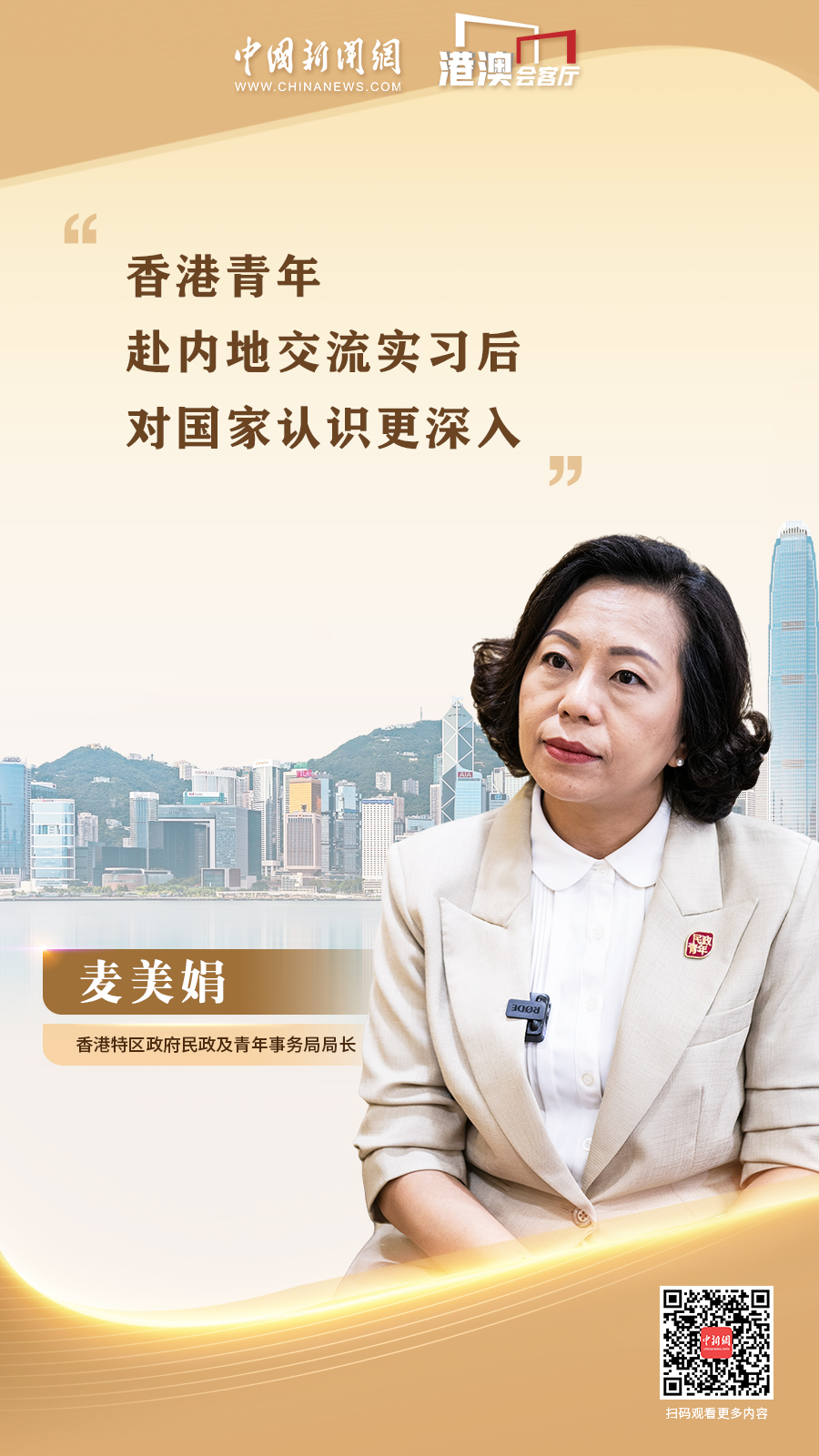 香港特區(qū)政府民政及青年事務(wù)局局長(zhǎng)麥美娟近日接受中國(guó)新聞網(wǎng)“港澳會(huì)客廳”欄目專訪時(shí)表示,香港青年赴內(nèi)地交流實(shí)習(xí)后對(duì)國(guó)家認(rèn)識(shí)更深入。