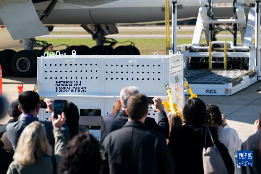 11月8日,在美國(guó)弗吉尼亞州的華盛頓杜勒斯國(guó)際機(jī)場(chǎng),裝有大熊貓的特制“旅行包廂”準(zhǔn)備運(yùn)上專機(jī)。新華社記者劉杰攝
