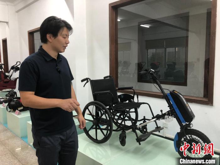 10月17日,臺(tái)灣青年楊博弘向記者介紹公司新產(chǎn)品電動(dòng)輪椅車頭。中新社記者 孫秋霞 攝