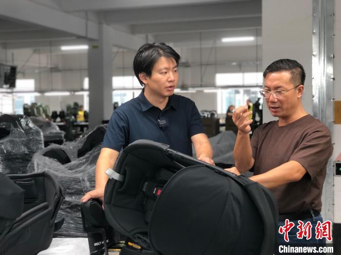 10月17日,臺(tái)灣青年楊博弘(左一)在惠州工廠詢問(wèn)嬰童安全座椅生產(chǎn)情況。中新社記者 孫秋霞 攝