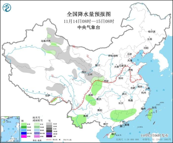 11月14日08時(shí)至15日08時(shí),新疆沿天山地區(qū)和南疆西南部、西藏北部和東部、青海北部和東部、甘肅大部、寧夏南部等地部分地區(qū)有小雪或雨夾雪。甘肅南部、陜西南部、湖南南部、江西南部、福建西南部、四川盆地、云南中部和西南部、廣西東部、廣東中北部、海南島東部、臺(tái)灣島等地部分地區(qū)有小雨。內(nèi)蒙古西北部、青海西部等地部分地區(qū)有5~7級風(fēng)。臺(tái)灣海峽、北部灣、瓊州海峽將有7~8級、陣風(fēng)9級的大風(fēng)。