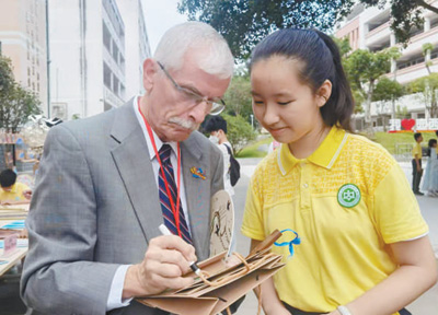 當(dāng)天,在代表團(tuán)的見(jiàn)證下,該?!帮w虎隊(duì)友誼學(xué)校暨青年領(lǐng)袖計(jì)劃”正式啟動(dòng)。據(jù)介紹,該項(xiàng)目計(jì)劃每年組織中美師生互訪,參觀飛虎隊(duì)?wèi)?zhàn)斗過(guò)的歷史遺跡和紀(jì)念館等,邀請(qǐng)美國(guó)飛虎隊(duì)老兵和后代、歷史學(xué)家與師生開(kāi)展交流,讓中美兩國(guó)年輕人在交流中增進(jìn)了解,讓兩國(guó)人民的友誼薪火相傳?!昂芨吲d看到很多人都沒(méi)有忘記飛虎隊(duì),希望飛虎隊(duì)精神代代相傳!”格林感慨地說(shuō)。