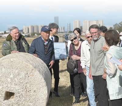 在云南昆明呈貢機(jī)場(chǎng)舊址,代表團(tuán)一行聆聽(tīng)講解員講述石碾背后的故事。呈貢機(jī)場(chǎng)曾是飛虎隊(duì)在昆明的主要基地之一,機(jī)場(chǎng)建設(shè)期間,當(dāng)?shù)厝嗣窭瓌?dòng)巨大石碾平整跑道,付出艱苦努力。