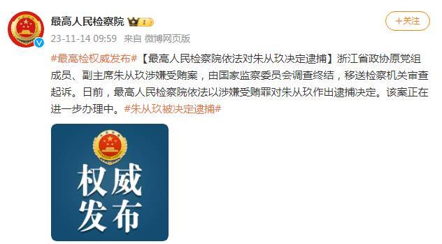 中新網(wǎng)11月14日電 據(jù)最高人民檢察院官方微博消息,浙江省政協(xié)原黨組成員、副主席朱從玖涉嫌受賄案,由國家監(jiān)察委員會(huì)調(diào)查終結(jié),移送檢察機(jī)關(guān)審查起訴。日前,最高人民檢察院依法以涉嫌受賄罪對(duì)朱從玖作出逮捕決定。該案正在進(jìn)一步辦理中。