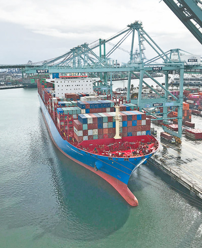 中遠(yuǎn)海運(yùn)集團(tuán)的遠(yuǎn)洋運(yùn)輸船舶??吭诿绹迳即壐畚鞲鄢丶b箱碼頭。