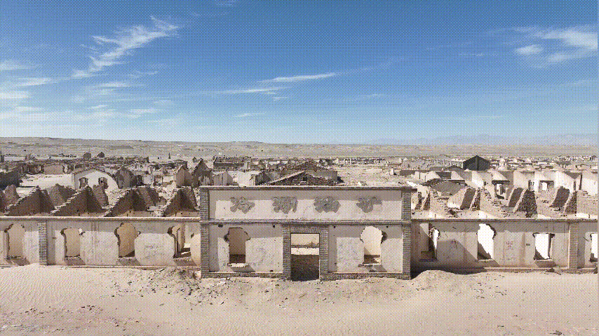 只余下被黃沙半埋的殘?jiān)珨啾?/p>