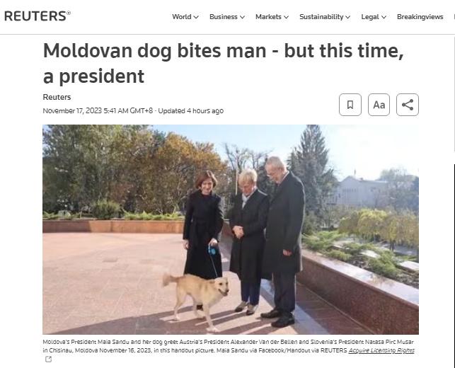 中新網11月17日電 據路透社援引摩爾多瓦媒體消息,當地時間16日,摩爾多瓦總統(tǒng)桑杜的愛犬在總統(tǒng)官邸咬傷了到訪的奧地利總統(tǒng)范德貝倫。