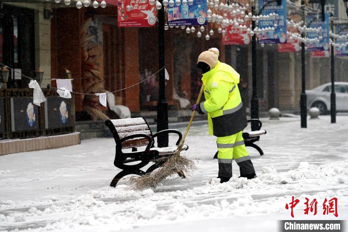 11月16日,環(huán)衛(wèi)工人在清理哈爾濱市街路上的積雪。趙宇航 攝